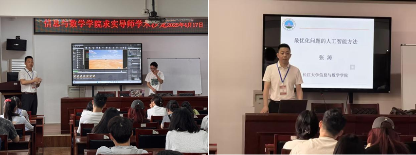 活动开场,张涛老师率先带来“最优化问题的人工智能方法”主题分享。他深入浅出地向同学们介绍了如何运用人工智能方法求解多目标规划、动态多目标规划、随机多目标规划以及二层多目标规划等问题。创新性地建立了复杂优化问题的求解新范式,大幅提升计算效率,同时还详细阐述了算法收敛性分析的基础工作框架,为在场师生打开了新的研究视野。