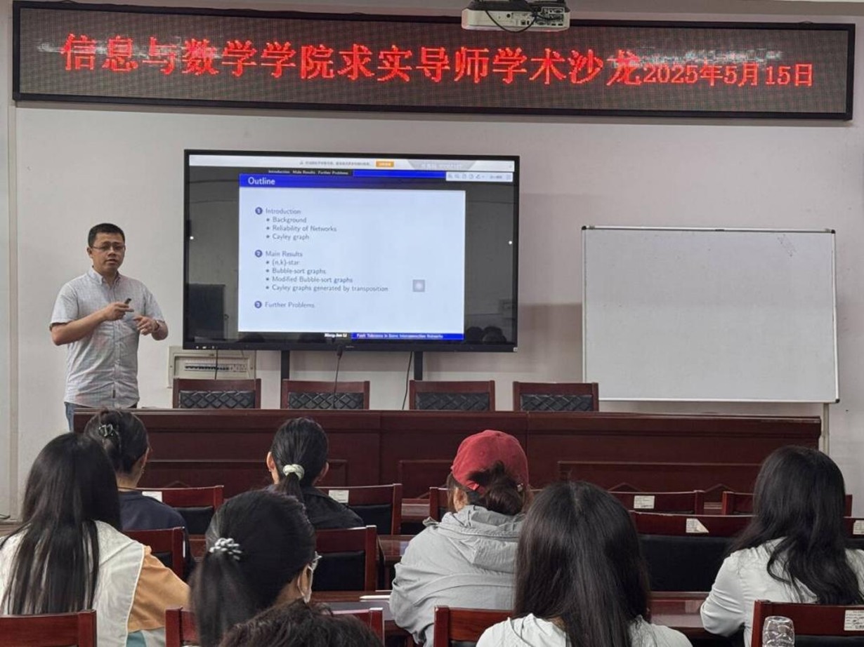 活动开场,李向军老师以“互连网络容错性研究”为主题拉开学术分享的序幕。他以深入浅出的表述,从现代超级计算机的前沿发展动态切入,由并行计算机的体系结构延伸至互连网络领域。李老师指出,在庞大的互连网络运行过程中,故障难以完全避免,因此设计并研究具备高容错性能的互连网络至关重要。鉴于互连网络需兼具良好的可扩性与对称性,借助代数方法生成的图是理论计算机研究的重要对象。随后,他聚焦于对换生成的 Cayley 图展开介绍,着重阐述了星图和对换树生成的 Cayley 图在容错性研究中的关键进展,同时分享了其团队在一般对换生成的 Cayley 图容错性研究中的主要工作。报告内容既涵盖领域前沿动态,又包含细节处理的新观点,为在场师生拓宽了学术视野。分享尾声,李老师结合研究实践,提出了若干关于互连网络容错性研究的数学问题供大家思考与探讨。