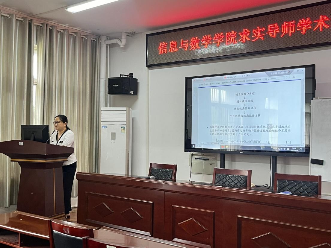 紧接着,徐丽平老师聚焦“随机微分方程的不变性”,以集合不变性为核心构建理论框架。她指出,不变性问题的本质是探索系统约束条件,确保从集合 K出发的解始终保持在K内。随机微分方程的不变性本质上也就是随机微分方程解的一种稳定性。她随后介绍了随机微分方程不变性的研究现状及几种常用方法,即随机切锥和随机正交锥、距离函数以及二阶微分方程的粘性解等方法。“不变性理论是研究随机系统长时间行为的‘金钥匙’。”徐老师强调,该理论在吸引子分析、同步控制及周期解研究中具有不可替代的作用。