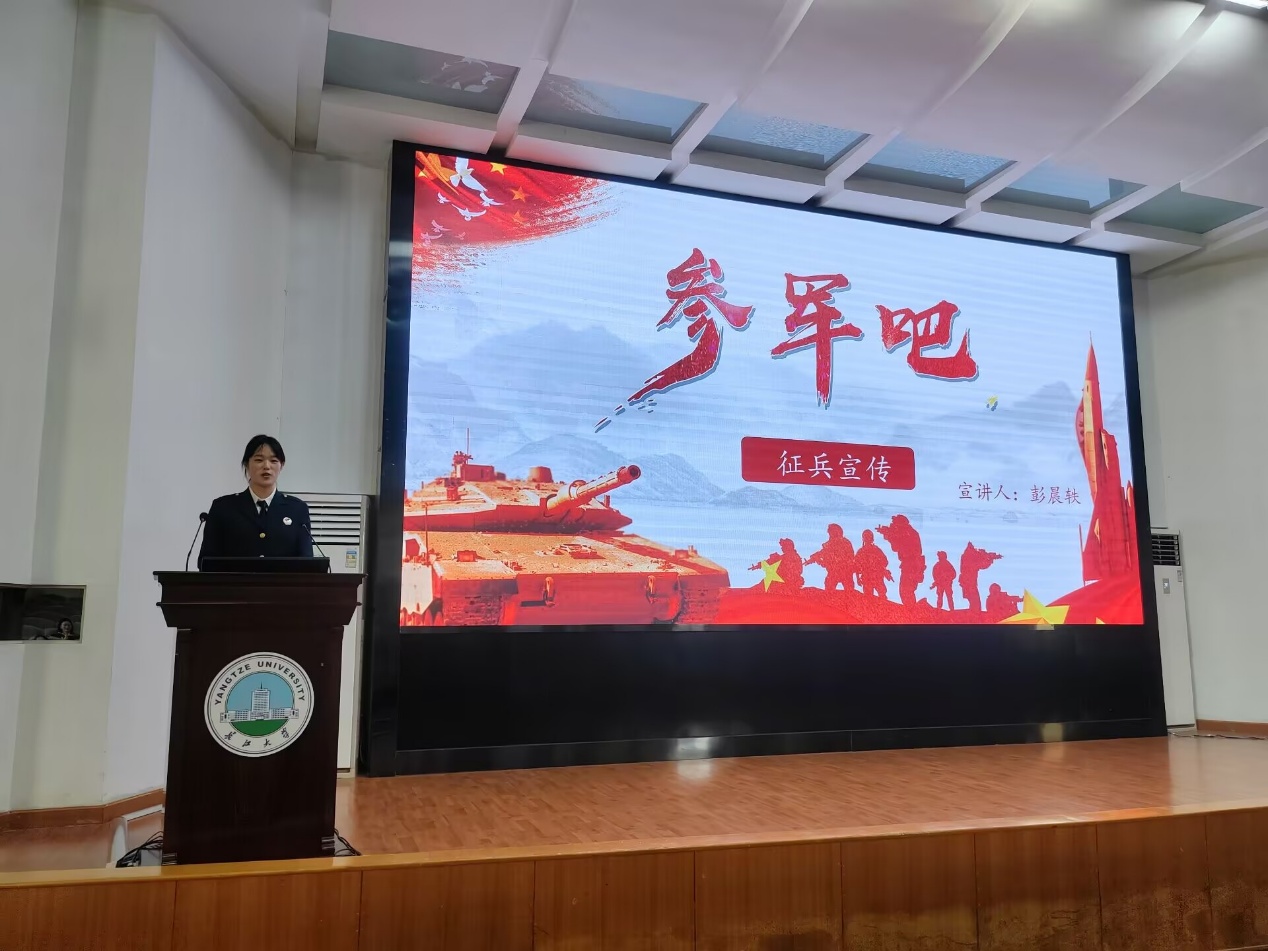 随后,彭晨轶带来了征兵宣讲。彭晨轶凭借丰富的经验与专业知识,围绕征兵政策、入伍条件、军队发展机遇以及军人待遇保障等内容进行了详细解读。他结合实际案例,生动展现了军旅生活的独特魅力与对个人成长的锤炼作用,鼓励同学们将个人理想融入国家发展大局,踊跃报名参军,在绿色军营中绽放青春光彩,书写无悔人生。宣讲激发了同学们的参军热情,不少同学表示将认真考虑投身国防事业,为强国强军贡献力量。