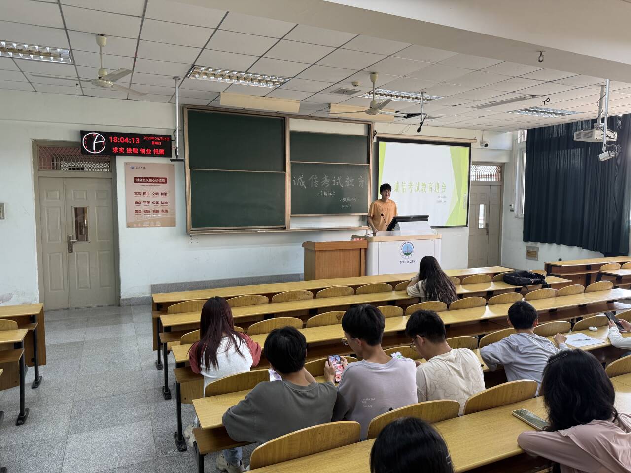 在非毕业年级,首先召开考风考纪及安全教育大会。各班班主任通过讲解考试违纪处分规定,结合近年来校内校外的考试违纪处分案例,如某学生因夹带纸条被取消考试成绩、记入诚信档案,最终影响评优评先和保研资格等,用真实且惨痛的教训为同学们敲响警钟。接着,全体学生在庄严的氛围中签署长江大学考试诚信承诺书,承诺遵守考试规则,杜绝任何作弊行为。最后,班会围绕即将到来的期末系列考试展开全面考风教育,从考试纪律要求到答题规范,从考场注意事项到诚信考试的重要意义,班主任进行了细致入微的讲解,引导同学们端正考试态度,以扎实的学习成果迎接考试。考风考纪大会后,组织学生集中观看《湖北省2025年学生资助诚信教育暨金融知识进校园》宣传片,树立学生诚信金融意识。
