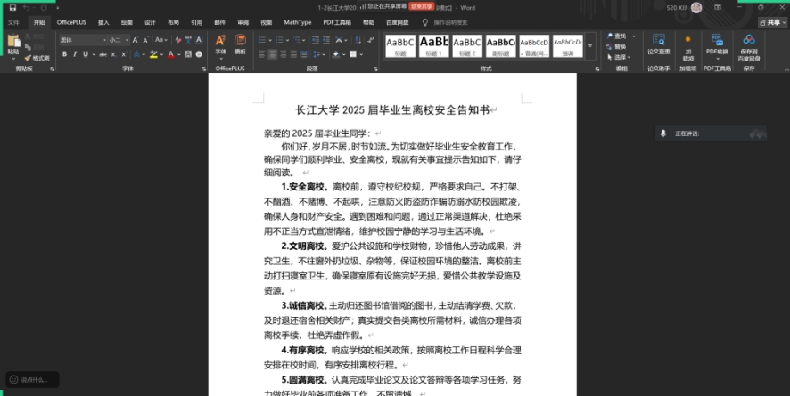会议中,黄昕宇首先详细解读了离校安全告知书的内容,强调签收告知书不仅是学校对学生安全的承诺,也是毕业生保障自身权益的重要环节。他提醒全体毕业生,离校前务必认真阅读并签收告知书,以明确相关安全责任和注意事项。