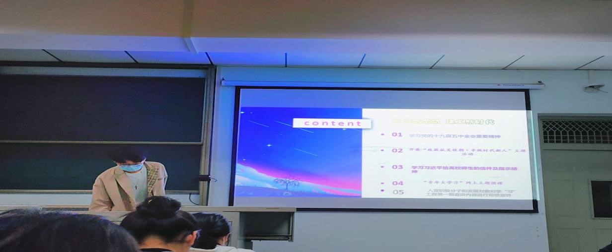 在"学习习近平给高校师生的信件及指示精神"这一主题下,团支书鲍泽智讲解了致学校师生建校100周年的贺信内容,贺信内容中习近平主席强调大学应坚持社会主义办学方向,紧扣立德树人根本任务。高校师生将秉持不断改革创新、追求卓越的初心,为实现中华民族伟大复兴的中国梦为目标作出更大贡献。