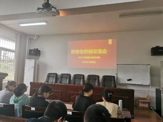 优秀研究生蔡高成、孙慧乐与全体新生一起进行“新老生经验交流”。