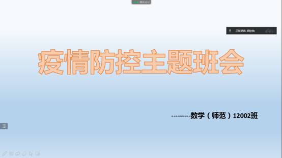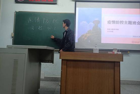 此次班会由班长主持,各班长采取线上、线下不同形式详细介绍了当前疫情防控的形势、学生个人防控须知、以及学校疫情防控的具体细则等内容,并告知学生自觉遵守学校在常态化疫情防控期间的各项规章管理,落实外出需请假、身体状况异常及时上报、不隐瞒个人行程、今日校园按时定位打卡等具体要求。呼吁学生规范佩戴口罩,保持安全社交距离,非必要不外出、不聚集,另外心理上也要保持良好心态,不恐慌、不惧怕,积极进行适当体育锻炼,提高自身免疫力。