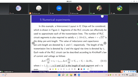 方雅馨同学报告就模型降阶方法是优化设计、优化控制和反问题应用中常见的方法。方雅馨同学的精彩报告中考虑了离散时间系统在频域的模型降阶问题,给出了两种算法,搭建起了连续系统和离散系统之间的桥梁。将一个较大型系统降阶为一个近似的较小的系统, 从而达到降低计算维数、减少运算量和数据存储量的目的。并且还能够使得降阶后的较小系统能够保持原较大系统的一些固有结构和性质。