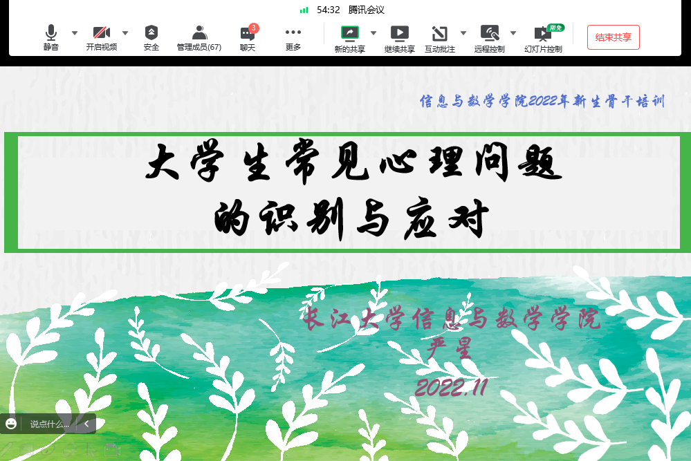 在长江大学东校区13教C522教室和腾讯会议分线上线下举行了“学生骨干心理培训大会”。全体新生班级班长、副班长、团支书、心理委员、寝室长参会,培训会由大福娱乐城