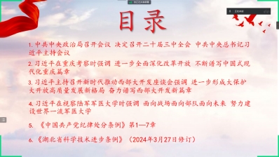 会上同学们集中学习了习近平总书记在重庆考察、主持召开新时代推动西部大开发座谈会等重要场合的讲话精神。探讨了进一步深化改革开放,推动西部大开发的新要求和新举措。总书记的讲话激励着同学们迎接挑战,积极投身强国建设、民族复兴的伟大事业中去。此外,同学们还学习了《中国共产党纪律处分条例》的第1—7章内容,以及最新修订的《湖北省科学技术进步条例》,加深了对党的纪律和我省科学技术方面立法知识的理解和掌握。