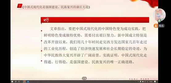 会议伊始,程讯简短介绍了学习内容并强调了会议的重要性。随后她带领同学们仔细研读习近平总书记所强调新疆在国家全局中战略定位的发言,深入分析了总书记的重要文章——《中国式现代化是强国建设、民族复兴的康庄大道》。习近平总书记的讲话与文章,为做好党的民族工作提供了根本遵循,进一步使同学们铸牢中华民族共同体意识,深入学习中国式现代化的科学内涵。随后程讯宣读了《高等学校预防不端与处理学术行为办法》,要求同学们会后仔细阅读,严禁学术不端行为。会议最后大家一起学习了校党委书记王建平讲授的廉政党课和校长刘勇胜在新学期工作部署会议上的讲话。