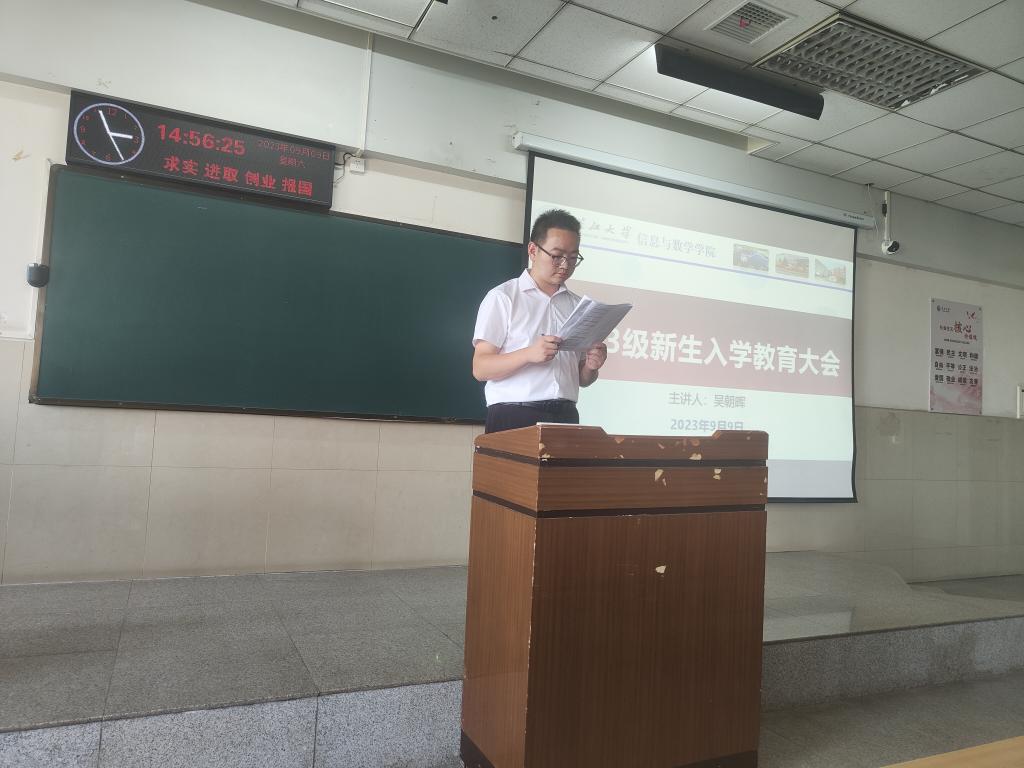 在12教402召开2023级本科新生入学教育大会。本次班会围绕本科生的日常管理、校纪校规、防诈骗、心理健康教育等方面展开,学院全体2023级本科生参会,会议由新生辅导员吴朝晖主持。