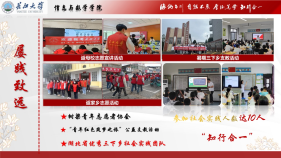 在学生工作中,支部成员担任多个重要职务,如长江大学青总队主席、团委学生会科创部部长、组织部部长等,积极参与学校的各项管理和服务工作。在志愿服务方面,全员参与,累计服务时长超过600小时,涵盖图书整理、创文值守、会议志愿服务、文明校园清扫等活动。此外,支部还积极组织返母校志愿宣讲、返家乡志愿活动和暑期三下乡支教活动,其中暑期三下乡支教团队荣获湖北省优秀三下乡社会实践团队,以实际行动践行“知行合一”的理念,展现出强烈的社会责任感。