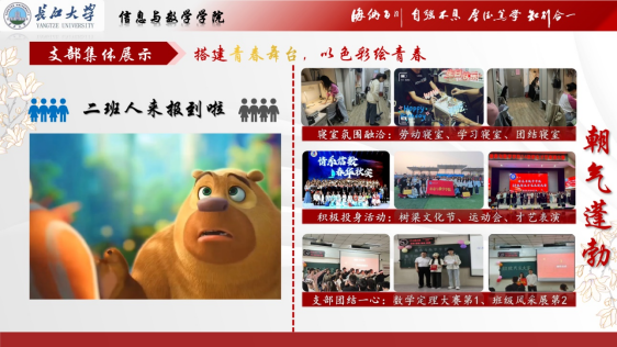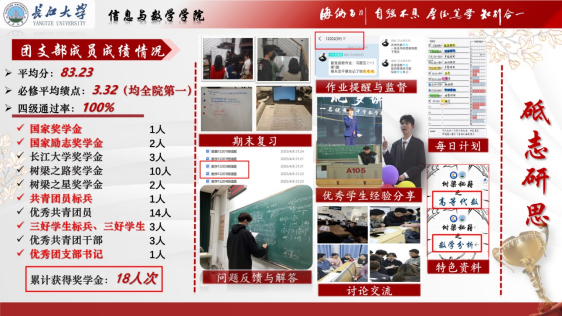 学习方面,数学12202支部成绩优异。班级平均分为83.23,必修平均绩点3.32,均在全院排名第一。四级通过率高达100%,在学业上展现出扎实的基础和良好的学习态度。众多同学凭借努力获得多项奖学金,累计获奖达18人次,其中国家奖学金1人、国家励志奖学金2人。为了提升整体学习水平,支部组织期末复习活动,分享学习资料,如“树梁秘籍”等特色学习资料,涵盖数学分析、高等代数等课程内容。优秀学生定期开展经验分享会,交流学习方法和心得。在科研竞赛方面,支部成员表现出色,参与大创项目4人,获得2项校级大创项目立项。在全国数学建模竞赛、全国大学生数学竞赛、全国高校计算机能力挑战赛等多项赛事中屡获佳绩,获得高教社全国数学建模国一、省一、二、三等奖,全国大学生数学竞赛省一、二、三等奖若干,在学科领域展现出较强的专业素养和创新能力。