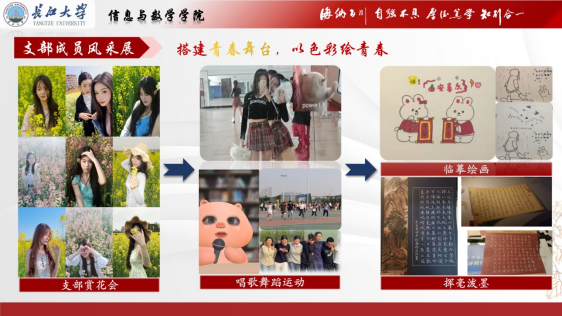 数学12202支部注重文化建设,营造积极向上的氛围。寝室文化丰富多彩,有劳动寝室、学习寝室、团结寝室等多种类型,促进成员间的交流与互助。积极参与学校的各项文化活动,如树梁文化节、运动会、才艺表演等,在支部赏花会等活动中,成员们展示才艺,增进感情,增强了支部的凝聚力。