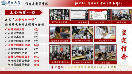 在思想建设上,该支部以理想信念教育为核心,深入贯彻党的二十大精神,积极动员团员向党组织靠拢。严格落实“三会两制一课”,定期开展主题团日活动、团员大会、团支委会和团小组会,全年共召开团员大会4次、团支委会4次、团小组会3次,开展主题学习团课3次。通过观看视频、撰写感悟、知识竞答、读书会分享沙龙等丰富多样的形式,引导团员学习习近平新时代中国特色社会主义思想。目前,支部已有12名入党积极分子、2名发展对象、1名中共预备党员和1名中共党员,在学院中发挥着思想引领的先锋模范作用。同时,积极参与“青年大学习”,学习率达到100%,并通过制作总结推送、宣传海报等方式,强化宣传工作,营造浓厚的学习氛围。