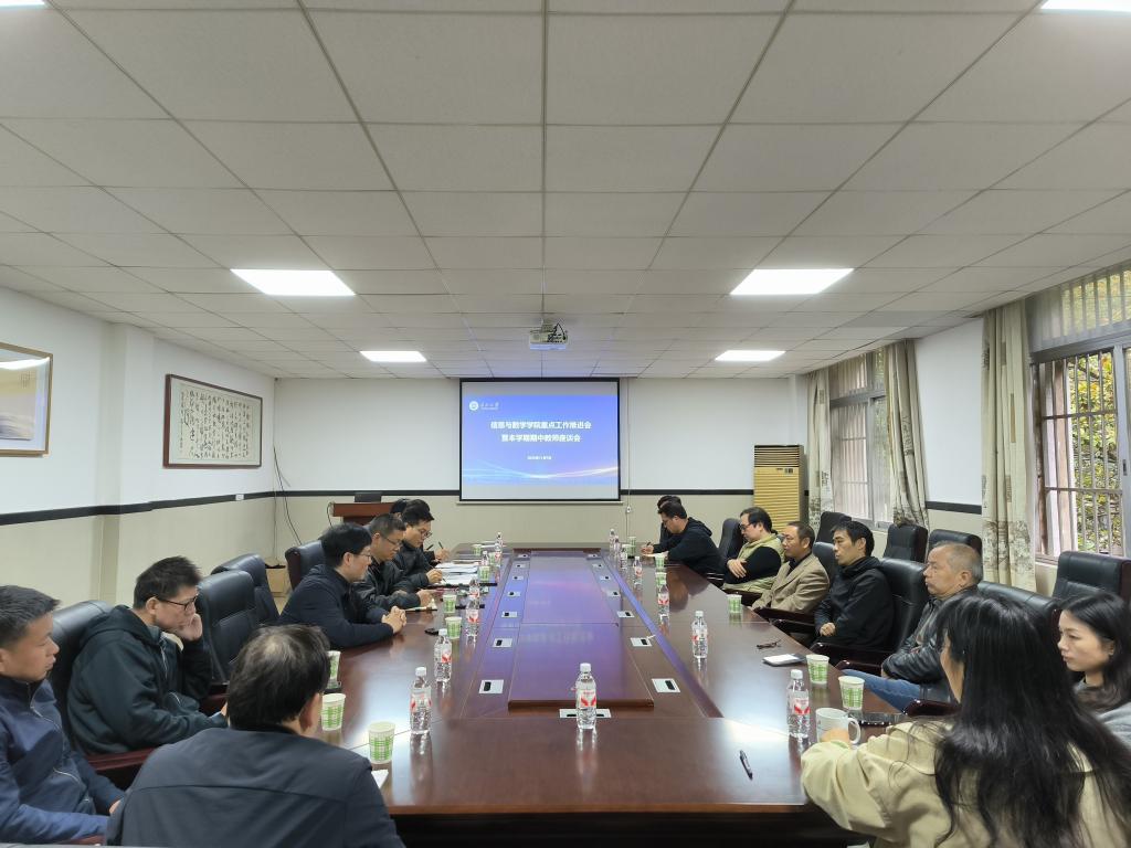 在8教210会议室召开重点工作推进会暨期中教师座谈会。学院党委书记毛德波、党委副书记谷军、教学副院长李向军,以及各系主任、团队负责人与教师代表参会。会议由李向军主持。