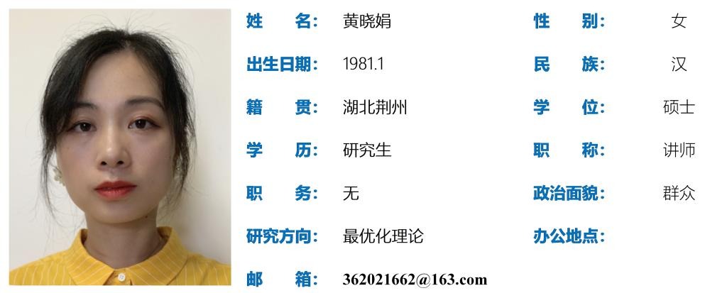 黄晓娟,女,生于1981年1月,硕士,讲师,主要研究生方向为最优化理论,获长江大学青年教师讲课比赛一等奖1项,三等奖1项,发表学术论文8篇,指导湖北省高校师范专业教学技能大赛获一等奖3项、二等奖2项。