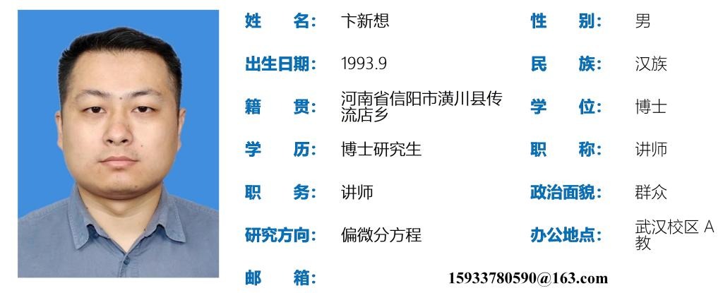 卞新想,男,1993年9月出生,博士研究生,讲师。主要研究方向:流体力学中涡流动力系统的数学理论研究;参与国家自然科学基金委员会面上项目“可压缩Navier-Stokes方程组黎曼解的稳定性”, 课题编号:12171459, 起止年月: 2022-01-01 至 2025-12-31;在Communications in Mathematical Analysis and Applications 和 Communications in Mathematical Sciences以第一作者各发表一篇文章。