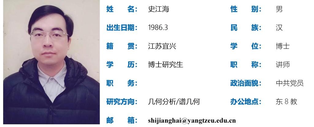 史江海,男,博士,讲师,主要研究方向为几何分析、谱几何。2018年6月毕业于武汉大学数学与统计学院;主持湖北省教育厅科学技术研究计划重点项目1项;发表学术论文8篇;获得长江大学教学质量优秀奖1项。